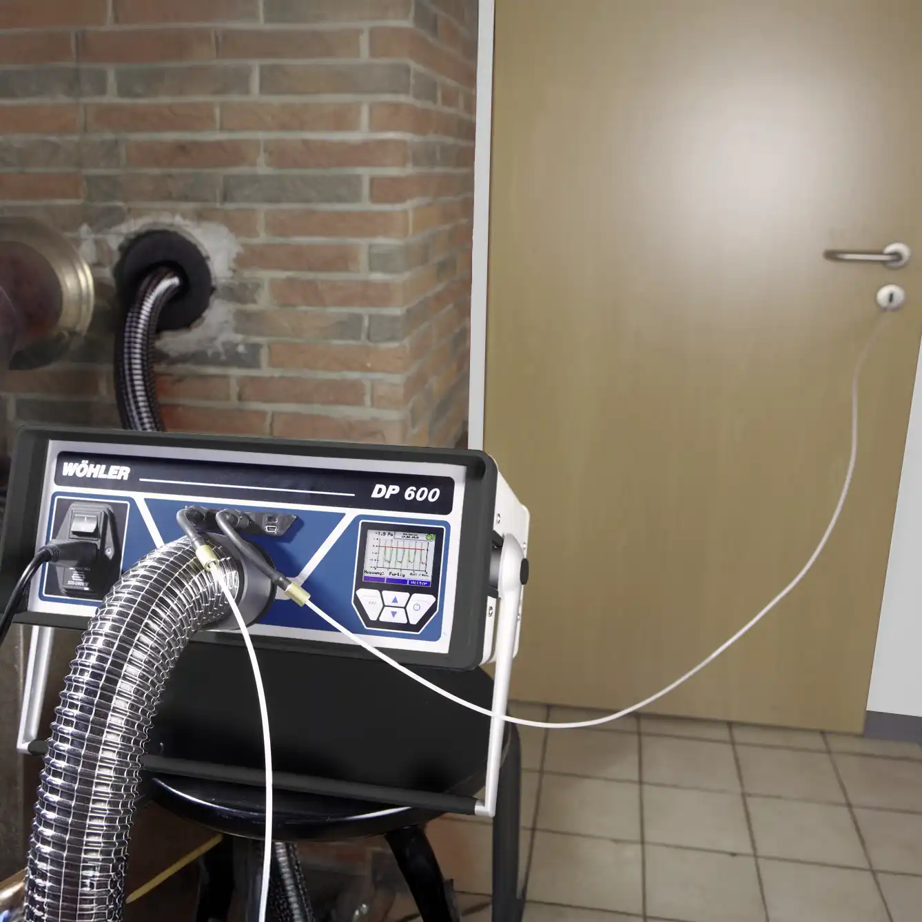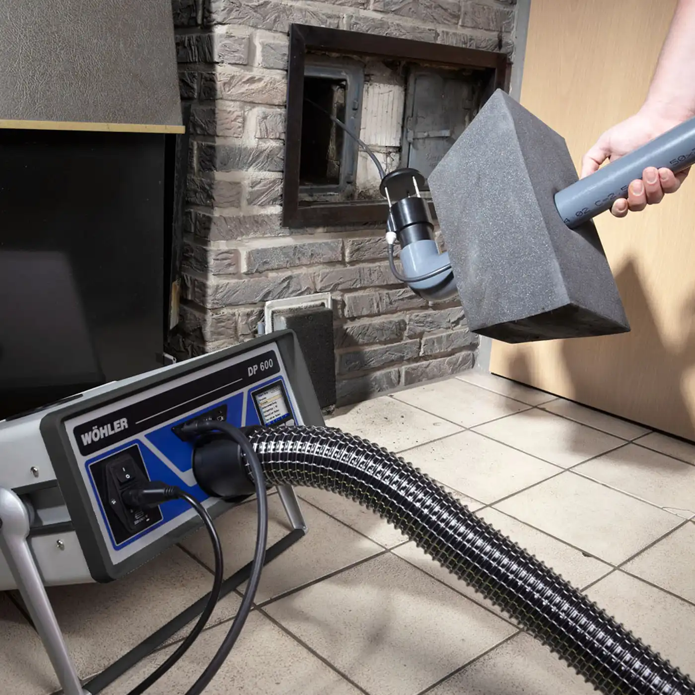 The Wöhler DP 600 simulates the combustion air inlet of a fireplace. After the user has entered the capacity of the fireplace, the Wöhler DP 600 will produce automatically the corresponding volume flow which passes through the chimney and will register the pressure progression in the room.