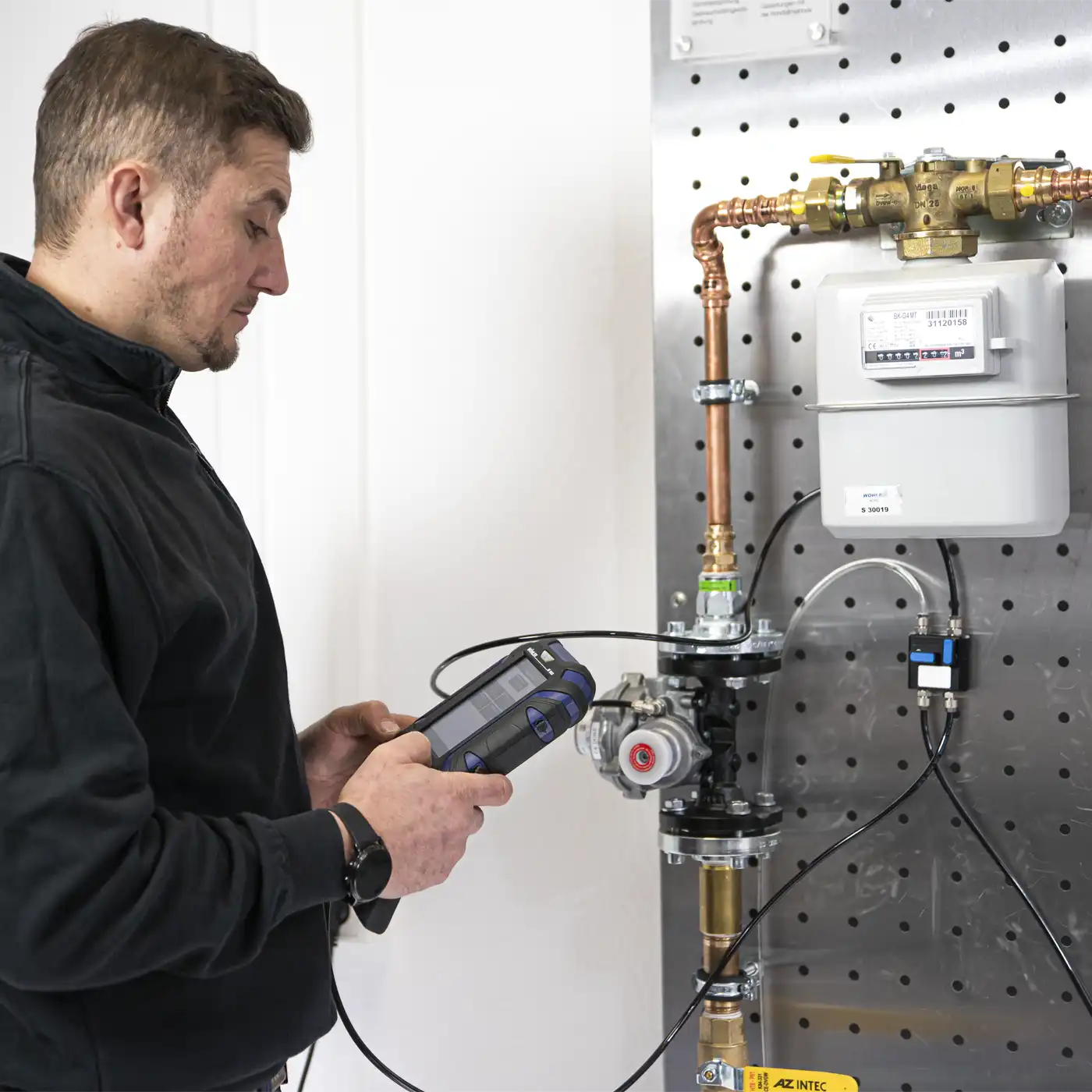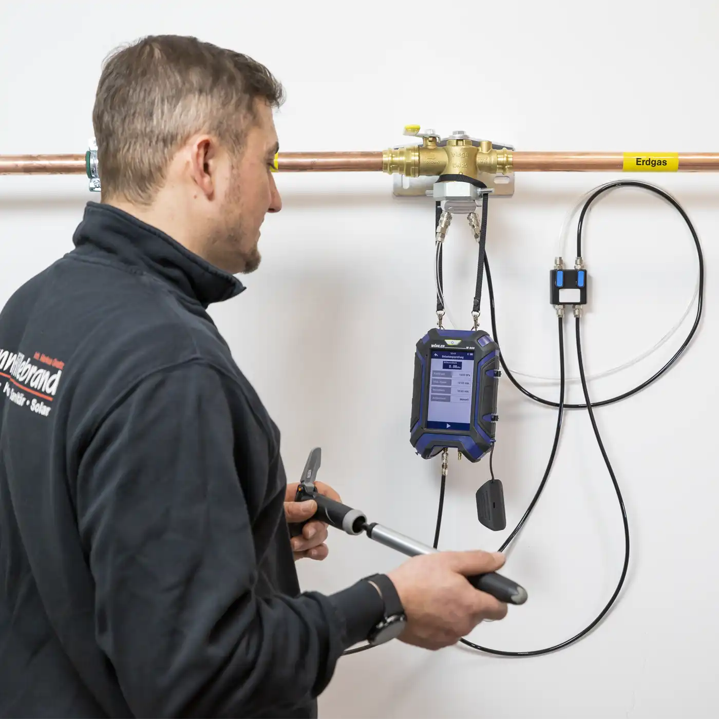 With the appropriate accessories, the newly installed gas line is easily pressurised with the test pressure for the stress test (1 bar).