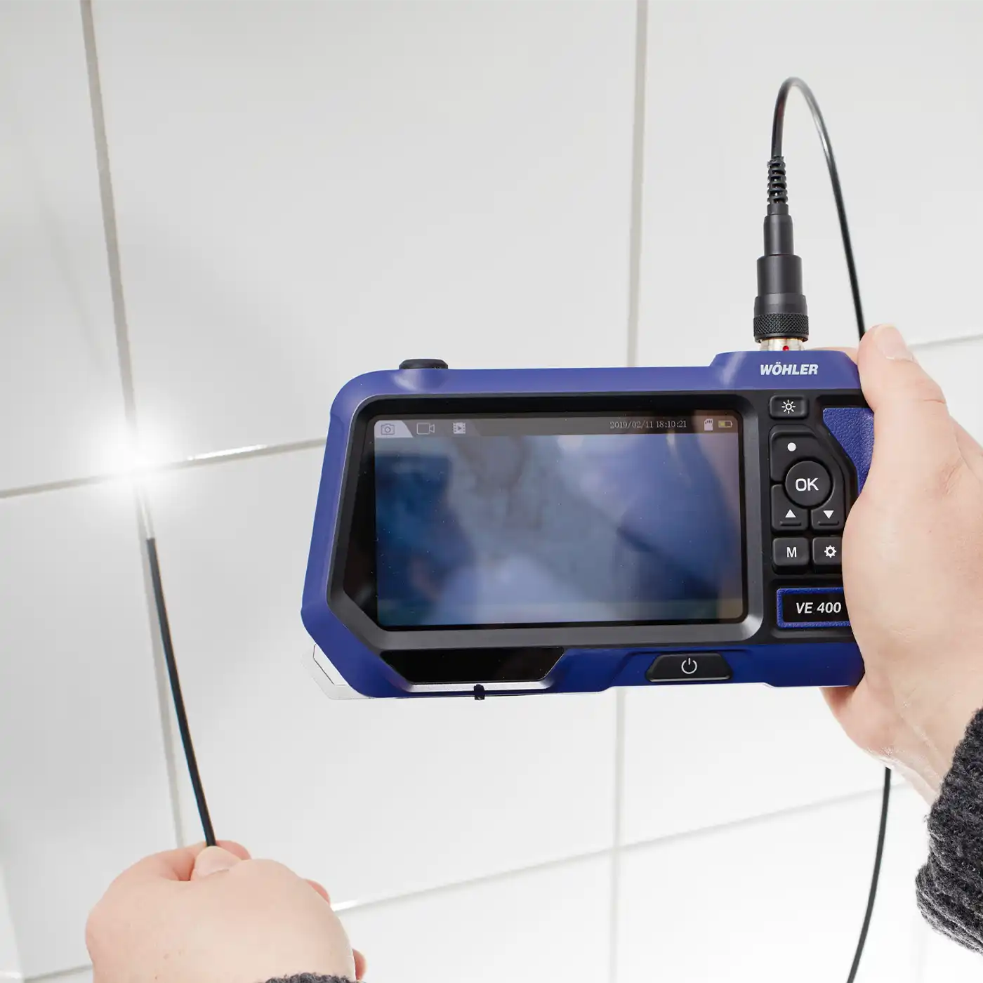 The Wöhler VE 400 HD video endoscope is ideally suited for HD inspection of inaccessible cavities through smallest openings from Ø 6 mm (e.g. tile cross). Further areas of application are e.g. pre-wall installations, fireplaces, combustion chambers, connecting pieces, sinks or drain pipes, as the camera head is waterproof (protection class IP 67). With its Ø 5.5 mm, the endoscope is also suitable for inspecting inspection openings and fire dampers.